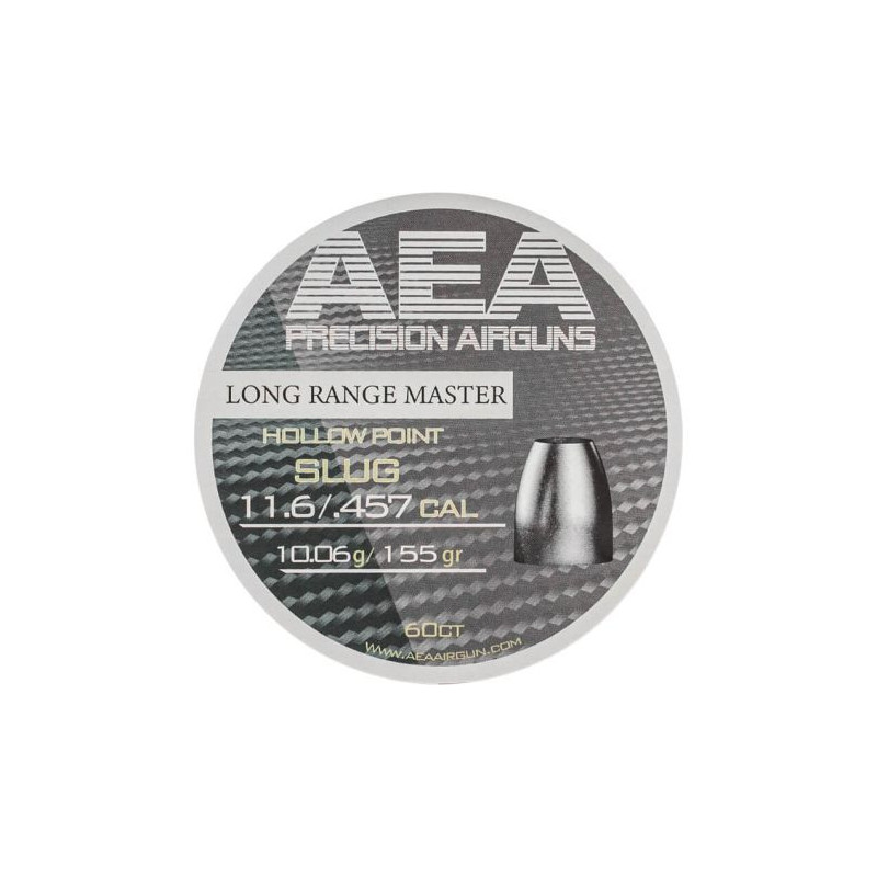 AEA Long Range Master 11,6 mm (.457) HP 155,5 Grain Slugs sind für den Einsatz in Hochleistungs-Luftgewehren konzipiert. Ihre aerodynamische Form macht sie für große Entfernungen geeignet, und das Gewicht sowie die Hohlspitze sorgen für hervorragende Wirkung.